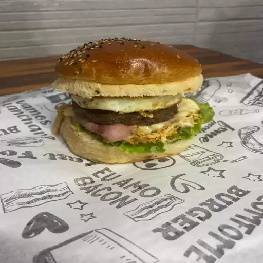 Pão brioche, alface, tomate, hambúrguer gourmet, queijo, presunto, ovo com bacon, orégano e barbecue.