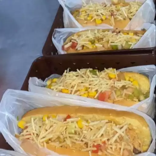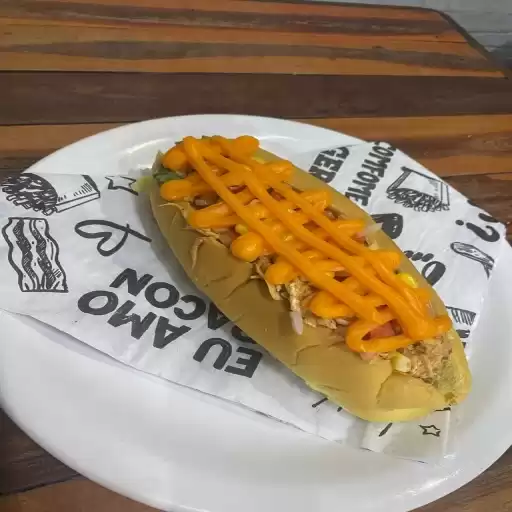 Pão, salsicha, carne, frango, milho, vinagrete, batata palha, cheddar
