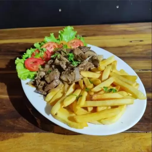 Pão, salsicha, carne, frango, milho, vinagrete e batata palha.