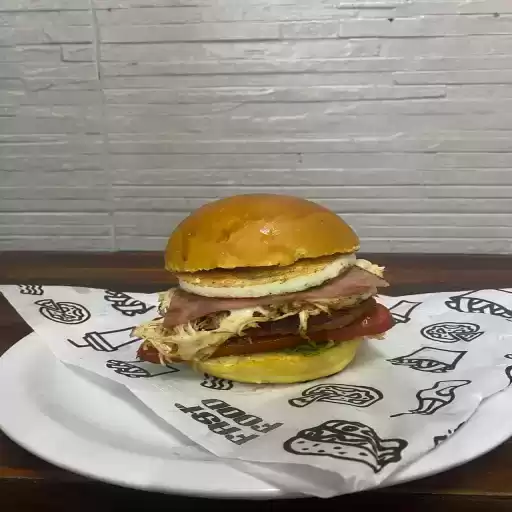 Pão brioche, alface, tomate, hambúrguer gourmet, frango desfiado, queijo, presunto, ovo com bacon, orégano e barbecue... Ver completo